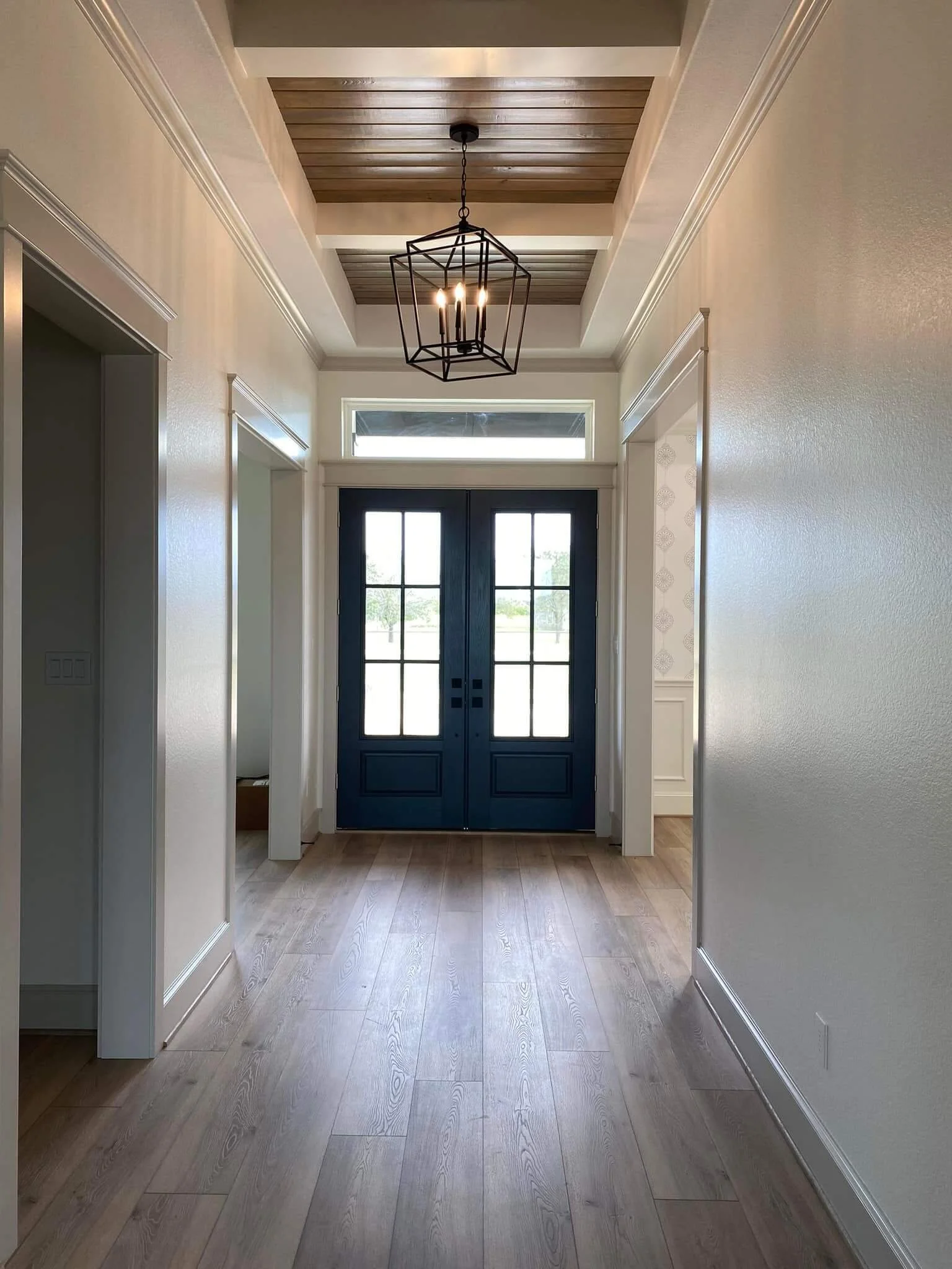 Entryway with dark double doors, light wood flooring, and a geometric chandelier hanging from a coffered ceiling.